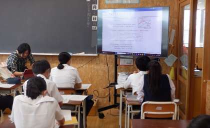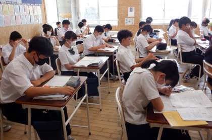 7月3日(月) 1限 2−Bの社会の授業風景です。テストの見直しをしています。