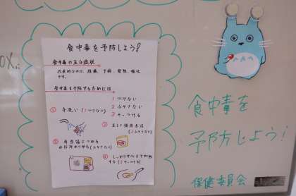 画像上は、保健委員会の活動です。校内に「食中毒予防」のポスターが貼られています。この時期は、食中毒が発生しやすいので気をつけたい物です。