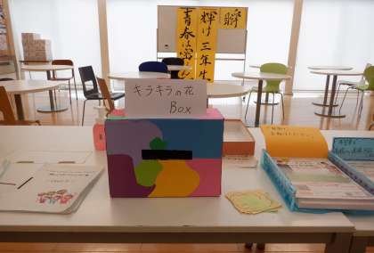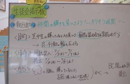 画像中・下は、生徒会執行部が企画している「仲間の輝きを見つけよう〜キラキラ週間〜」です。お互いのよさを見つけ、伝え合うことで、個性を認め合う温かな校風づくりを目的をしています。