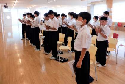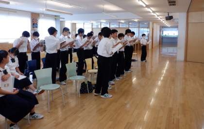 1−Cの音楽の授業風景です。ランチルームで、合唱の練習をしています。10月実施予定の合唱コンクールは、1年生にとって初めての行事です。1年生には、ぜひ合唱の楽しさを味わってほしいと思います。