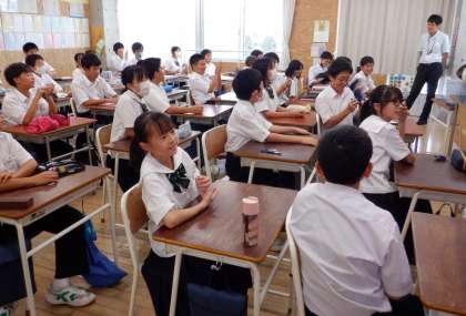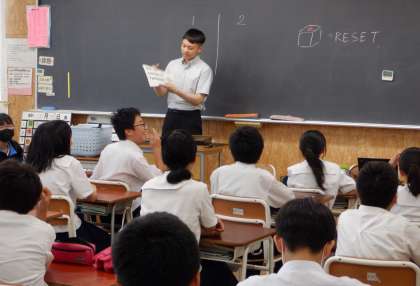 1−Cの英語の授業風景です。今日はALTの先生と、ゲーム形式で学習をしています。
