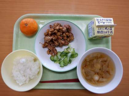今日の給食 公開日 2023/07/19 更新日 2023/07/19 芝園の一日 7月19日(水) 今日の給食メニューは、 ・ごはん ・牛乳 ・豚肉と大豆の甘みそがらめ ・つみれ汁 ・きざみあえ ・冷凍みかん です。 暑い日には、冷凍みかんのひんやり感がとても美味しかったです。