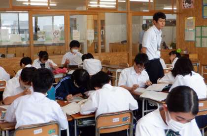 互いに教え合って 1−B英語 公開日 2023/07/19 更新日 2023/07/19 芝園の一日 7月19日(水) 3限 1−Bの英語の授業風景です。これまでの学習のまとめを、プリントで行っています。分からないところは、互いに教え合っています。