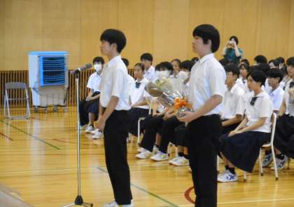 1学期で芝園中学校を離れられる先生の、離任式を行いました。
