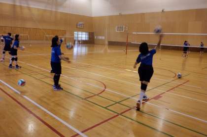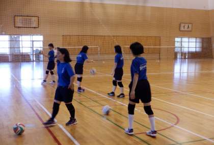 バレーボール部の活動の様子です。念入りにサーブ練習をしています。外部指導員音方のアドバイスを受けて、エースが狙えるサーブを打てるように・・・。練習あるのみ!