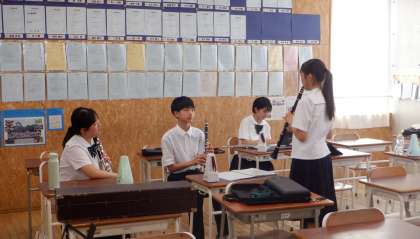 画像は吹奏楽部の活動の様子です。9月のコンサートに向けて、練習に取り組んでいます。