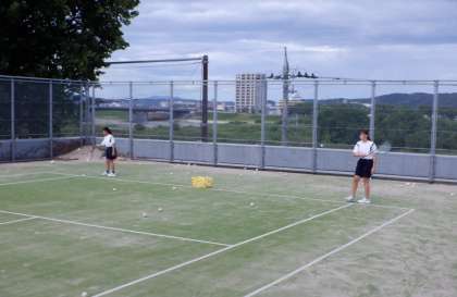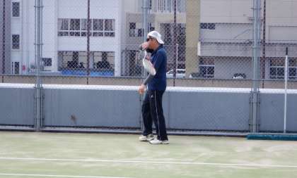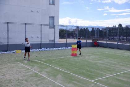 女子ソフトテニス部の活動の様子です。先生も日除け対策をバッチリ!