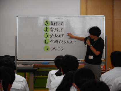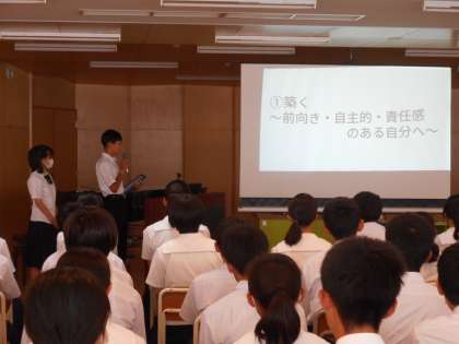 2学期最初の学年集会では、14歳の挑戦のスローガン案や諸注意を聞いた後、学年主任から「2学期は『きょうしつ』を大切にしよう」と話がありました。学校の中心となって動き始めるこの時期に、色んなことを『自分事』として受け止めて過ごしていきましょう!