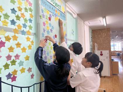 その後、『夏休みに頑張ったこと・成長したこと』を星に書いて学年フロアに掲示しました。綺麗な星空が壁面を彩っています。