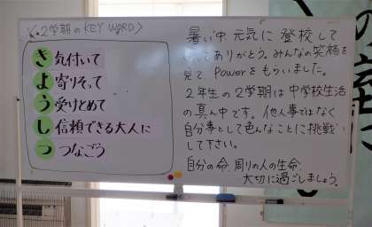 2学年のフロアには、昨日の学年集会での主任からのメッセージが掲示してあります。2学期も元気いっぱい、思いやりある学年をみんなでつくっていきましょう!