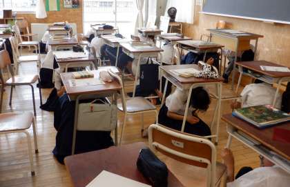 本校では、芝園小学校と合同で実施しました。「まず低く、頭を守り、動かない」を徹底して、真剣に取り組みました。