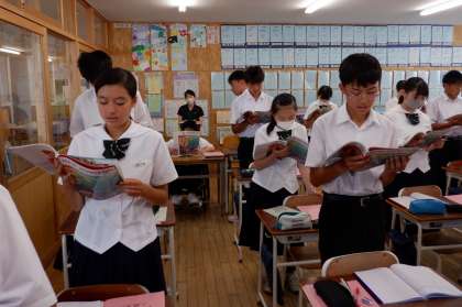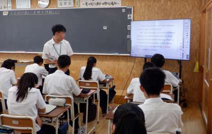 2−Aの英語の授業風景です。デジタル教科書を活用して「読む」練習をいています。