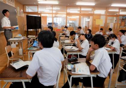 3−Aの社会の授業風景です。公民分野の学習で、本時は「少子高齢化」について考えています。先生の実体験を交えた話を、興味津々に聞いています。