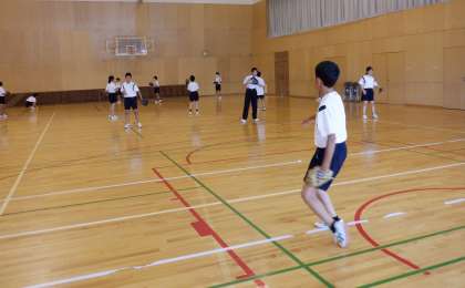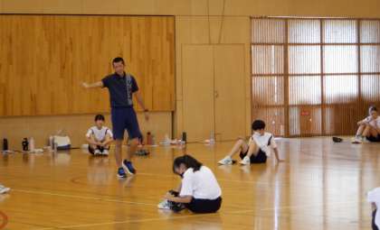 1−Cの体育の授業風景です。ソフトボールの授業を行っています。暑さ対策で、今日は体育館の中で活動をしました。