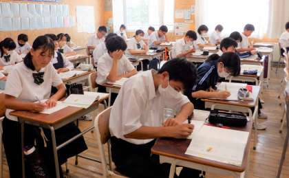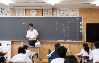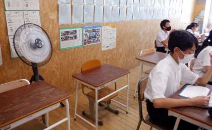 2−Cの国語の授業風景です。「盆土産」の教材で、学習をしています。全教室に扇風機も設置して、暑さ対策を行っています!