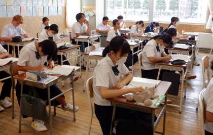 3−Bの国語の授業風景です。石垣りん氏の「挨拶 原爆の写真に寄せて」の教材で学習しています。3年生は、9月に修学旅行で広島を訪問します。この教材をとおして、原爆について一人一人が思いや考えをもって訪問できたらいいですね。