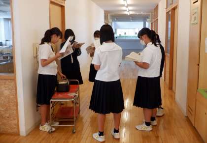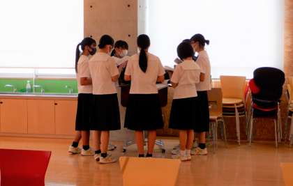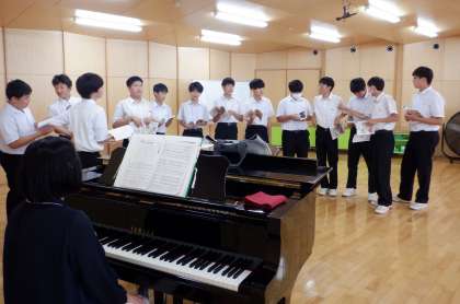 3−Aの音楽の授業風景です。合唱コンクールで歌う「友〜旅立ちの時〜」の練習をしています。各パートリーダーが中心となって、みんなで工夫して練習をしています。クラスで一つの曲を創り上げる過程、ステキですね!