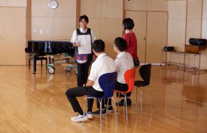 先日、2年生は「社会に学ぶ『14歳の挑戦』」に向けて学年集会を行いました。話し方や訪問の仕方など、先生方が劇をしながら例を示して確認をしました。先生方の劇に、生徒も大盛り上がり!