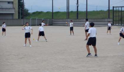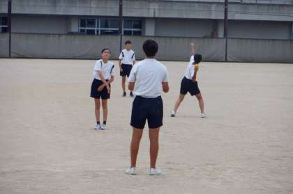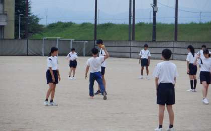 2−Aの体育の授業風景です。今日は教育実習生が中心となって、授業を進めました。ソフトボールの楽しさが伝わったかな〜