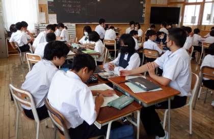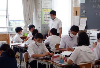 1−Aの理科の授業風景です。先日行った「アンモニアの噴水実験」の考察を行っています。どんな理由で、どんな現象が起きたのか・・・自分の言葉で説明をする練習です。お互いに説明し合うことで、確認をしています。