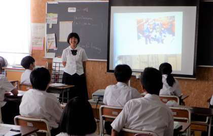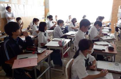1−Cの英語の授業風景です。自分の好きなことについて、英語でスピーチしています。聞き手の目を見て、一生懸命伝えています。