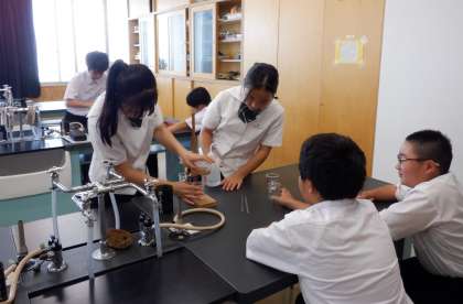 1−Bの理科の授業風景です。今日は「ろ過」の実験をしています。水に溶けている物質は、本当に取り除けないのか・・・興味津々です。