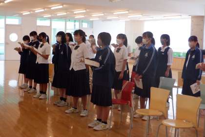 広島の空に響け 3−A音楽 公開日 2023/09/22 更新日 2023/09/22 芝園の一日 9月22日(金) 3限 3−Aの音楽の授業風景です。合唱曲「COSMOS」の練習をしています。3年生は、27日から修学旅行へ行きますが、27日の広島で行う「平和セレモニー」でこの「COSMOS」を全員合唱します。平和への願いをこめて・・・。