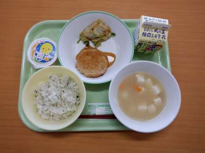 今日の給食 公開日 2023/09/26 更新日 2023/09/26 芝園の一日 9月26日(火) 今日の給食メニューは、 ・菜めし ・牛乳 ・鶏つくねのあんかけ ・白玉汁 ・おひたし ・お月見ゼリー です。 今日は「お月見献立」です。満月に見立てた鶏つくね、白玉、お月見ゼリーなど、季節を感じる献立です。白玉汁には星形のにんじんが! 調理員の皆さま、いつも美味しい給食をありがとうございます。