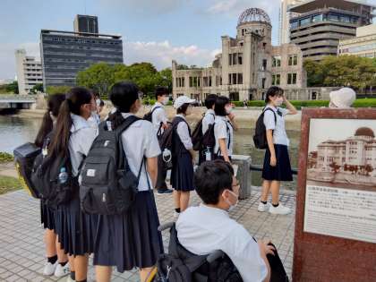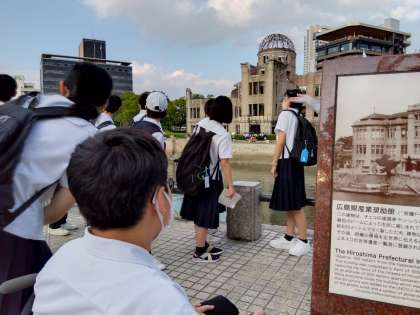 9月27日(水) 碑めぐりで、ボランティアさんのお話を聞いています。