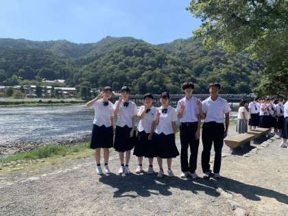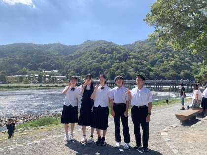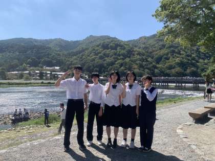 D組は、清々しい天候のもと、川のせせらぎを聞きながら過ごしています。クラスメイトと「はい、チーズ!」