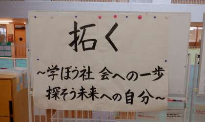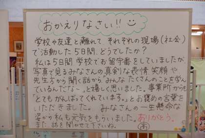 2学年のフロアには、学年主任からのメッセージが・・・。先週は「社会に学ぶ14歳の挑戦」で、生徒はそれぞれの事業所で活動をしてきたので、今日は久しぶりの登校です。