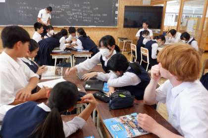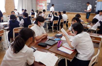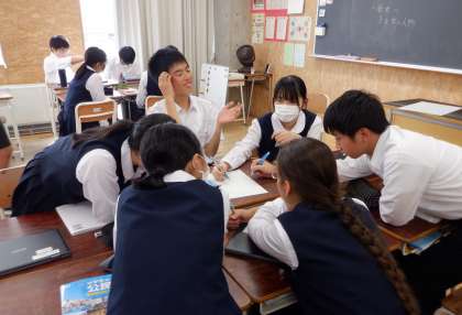 3−Bの学活の授業風景です。各班対抗のクイズをしています。