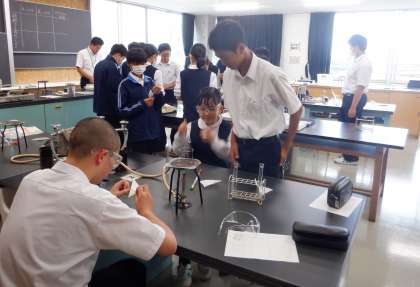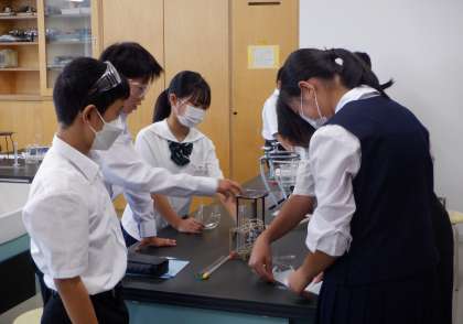 1−Bの理科の授業風景です。再結晶の実験をしています。生徒は、計画通りに慎重に実験を進めています。どのように再結晶が現れるか?意欲満々です。まさに、本校が目指す「アクティブな授業」です。