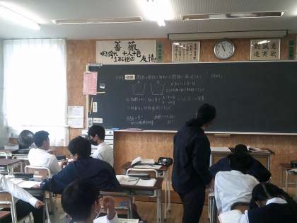 数学では、小学校での学びを振り返りながら、中学校で学んだ文字式を結びつけ、関数を身近な事例に利用することを考えています。クラスメートや先生に質問したり、自問自答しながら、課題に取り組んでいます。