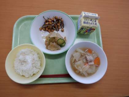 今日の給食 公開日 2023/10/10 更新日 2023/10/10 芝園の一日 10月10日(火) 今日の給食メニューは、 ・ごはん ・牛乳 ・小魚入りフライビーンズ ・ポトフ ・茎わかmサラダ です。 茎わかめも小魚や豆も噛み応えが十分。よくかんで食べましょう。