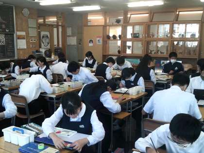 美術では、作品制作にじっくりと取り組んでいます。静寂の中、筆を手にして集中して取り組んでいます。