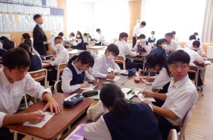 2−Bの英語の授業風景です。未来への自分に向けての手紙を、英文で表現しています。難しい課題ですが、先生や友達と相談しながら頑張っています。