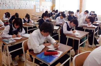 3−Aの数学の授業風景です。2次関数の問題を考えています。高い集中力で、教室がし〜ンと静まりかえっています。