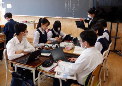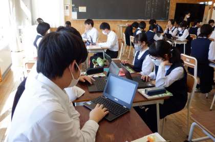3−Cの国語の授業風景です。「故郷」を学習して学んだことを、班でスライドにまとめています。互いに意見を出し合って、よりよいスライドの作成を目指しています。