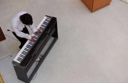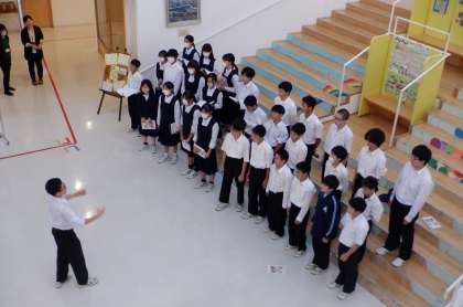 10月16日(月) 放課後 1−Bは大階段での練習です。 柔らかなピアノの音色が広がっています。