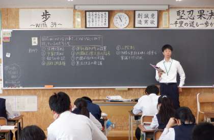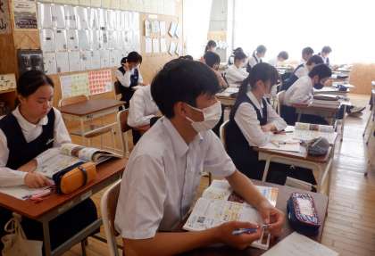 3−Dの社会の授業風景です。「国会の地位と仕組み」について学習をしています。集中している3年生、ステキです。
