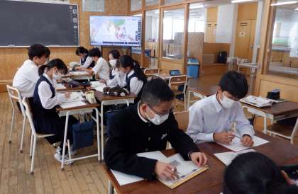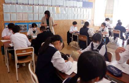 2−Bの社会の授業風景です。「なぜ欧米は植民地政策を進めたか」という課題について学習しています。自分の考えをお互いに伝え合うことで、考えを深めています。