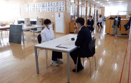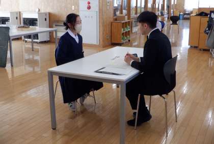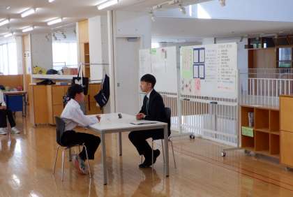 1−Bの英語の授業風景です。今日は、ALTの先生と英語のスピーチテストです。緊張していますが、みんな頑張っています!