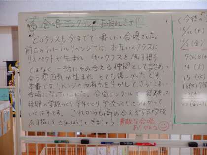 合唱コンクールを終えて、学年主任から生徒へのメッセージです。一つ一つの行事をとおして成長している2年生。これからは、生徒会も中心となります。期待しているよ!