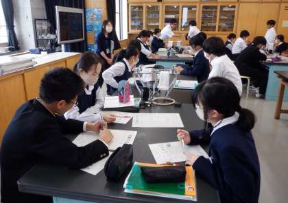2−Cの理科の授業風景です。「空き缶は、なぜつぶれたのか」という課題で学習をしています。大気圧によってつぶされた空き缶。どうしてこうなったのかについて、生徒は意見を交換し合って考えを深めています。思考がアクティブしています!