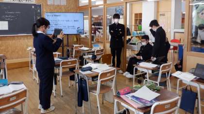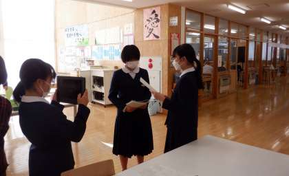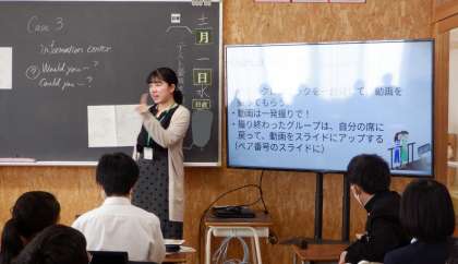 3−Cの英語の授業風景です。「困っている外国人を助けよう」という課題で、英会話の学習をしています。会話の様子を端末で録画して、振り返りに生かします。