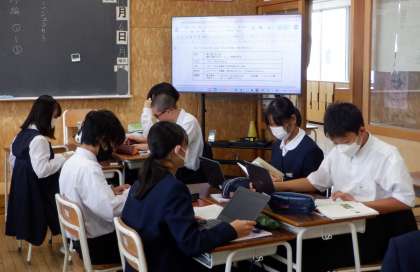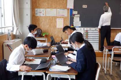 1−Bの国語の授業風景です。「『言葉』をもつ鳥、シジュウカラ」の学習をしています。端末を使って、文章の読み取りをしています。