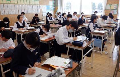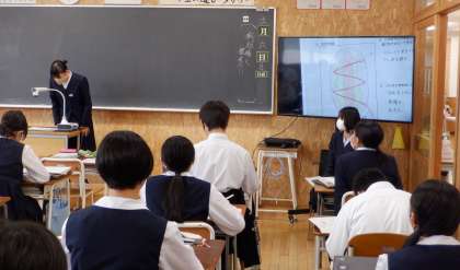 3−Cの家庭科の授業風景です。考えた幼児のおもちゃの説明をしています。対象年齢、どんな力を伸ばしたいか、工夫した点などを設計図をもとに発表しています。