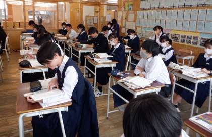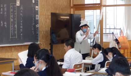 平家物語 その1 2−A国語 公開日 2023/11/13 更新日 2023/11/13 芝園の一日 11月13日(月) 1限 2−Aの国語の授業風景です。古典「平家物語」の学習をしています。「扇の的」の部分を、劇をして理解を深めています。