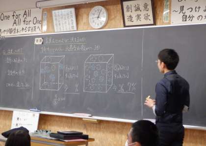 2−Cの理科の授業風景です。「湿度」について学習をしています。よく「今日は湿度が高いからじめじめしているね」という会話をしますが、それは一体どのような現象なのかを、科学的に説明します。